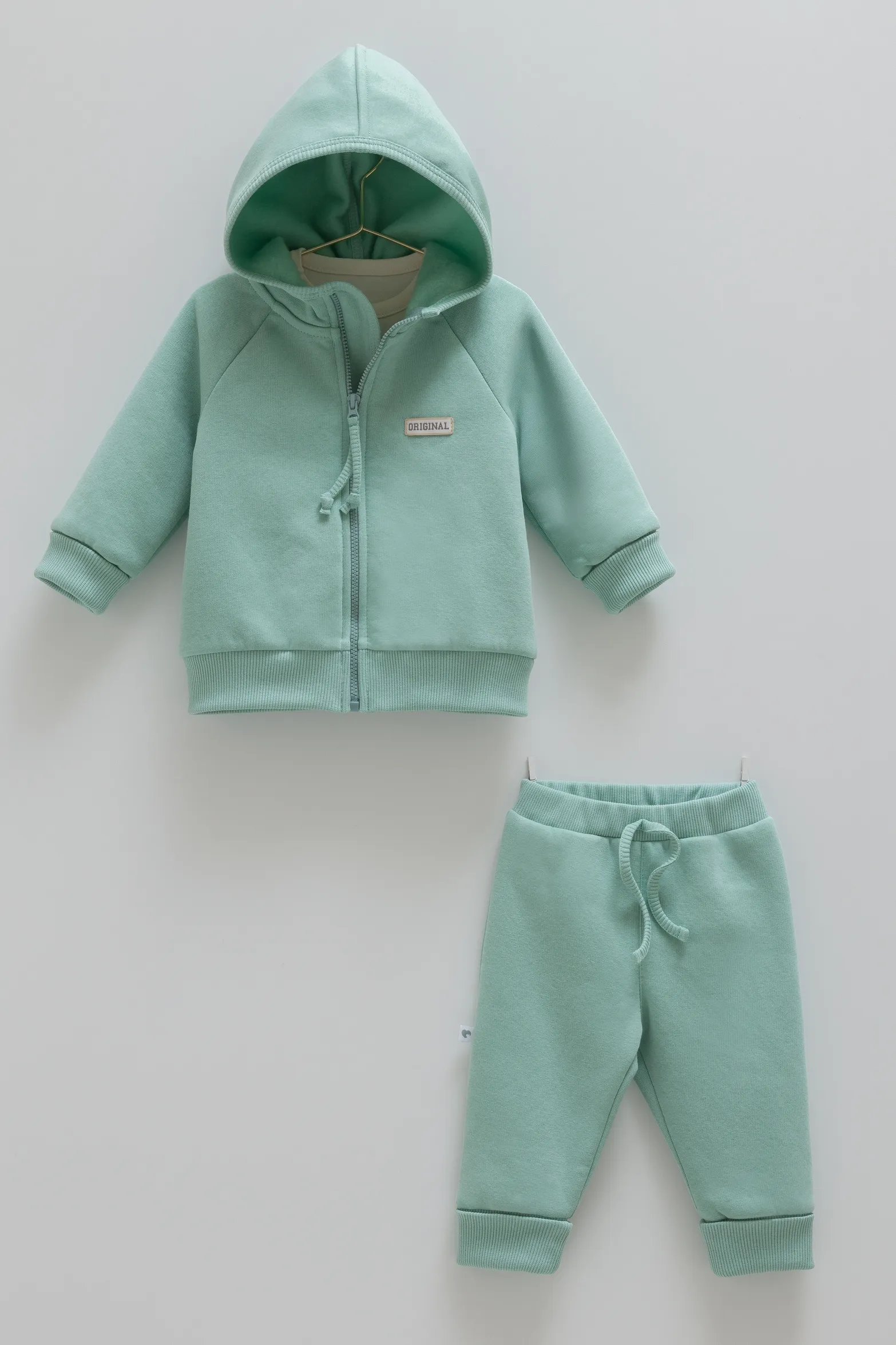 - Практичный состав: В комплект входит худи с капюшоном и молнией, белая футболка с принтом «ORIGINAL Baby» и спортивные брюки в тон.
