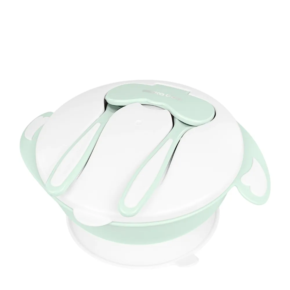 - Набор 4 в 1: миска, разделённая тарелка, ложка и вилка.