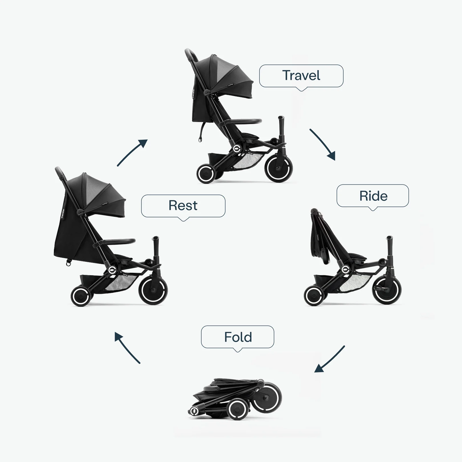 - Быстрое превращение из комфортной коляски в самостоятельный трицикл